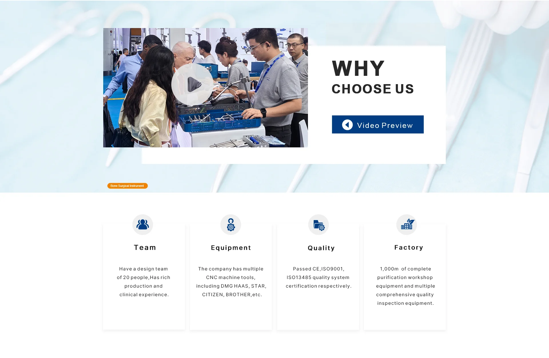 ผลิตภัณฑ์หลัก:เครื่องมือออร์โธปิดิกส์เครื่องมือสำหรับแผนกการเผาไหม้เครื่องมือเจาะและเลื่อยทางการแพทย์ชุดเครื่องมือวัดกระดูกพื้นฐานกล้องเอนโดสโคป
